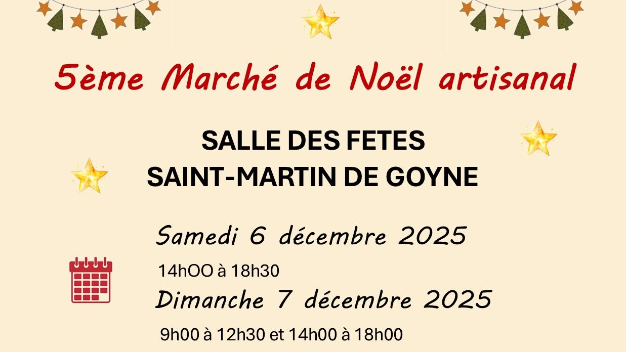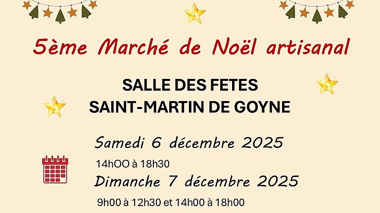 L’association LIVRES&PARTAGE organise la cinquième édition de son marché de Noël artisanal le samedi 6 décembre 2025 (de 14h00 à 18h30) et le dimanche 7 décembre 2025 (de 9h00 à 12h30 et de 14h00 à 18 h00) à la salle des fêtes de SAINT-MARTIN DE GOYNE.