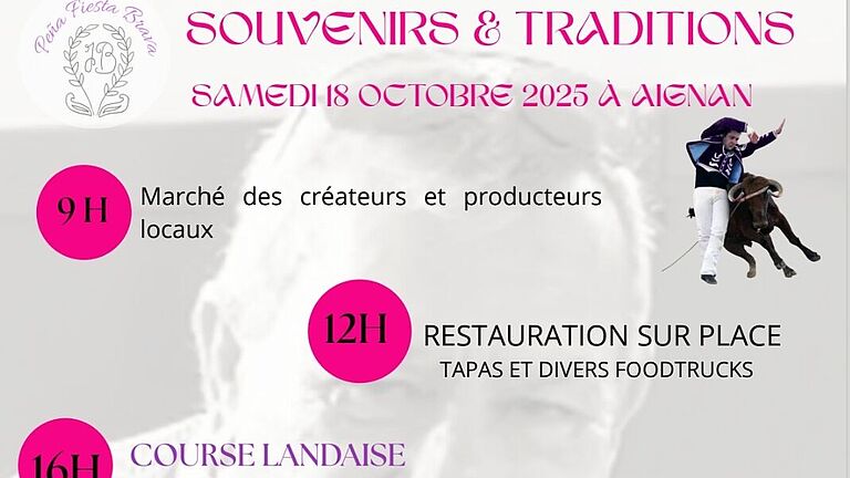 Souvenirs & Traditions, organisé par l'association Peña Fiesta Brava, rend hommage à Mr. Betous José en célébrant la richesse de la course landaise et ses traditions. Cette journée promet d'être une véritable immersion dans notre patrimoine local, avec une multitude d'activités mettant en lumière notre terroir. Rejoignez-nous pour vivre ensemble des moments inoubliables, alliant culture, convivialité et passion.
